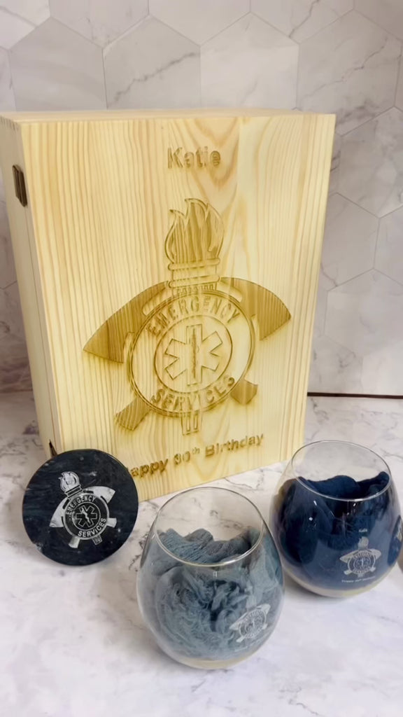 - Create a unique and memorable gift with our laser-engraved pair of wine glass tumblers made in Netherlands and black marble round coasters, elegantly presented in an engraved wooden gift box designed with a slot for your wine bottle.