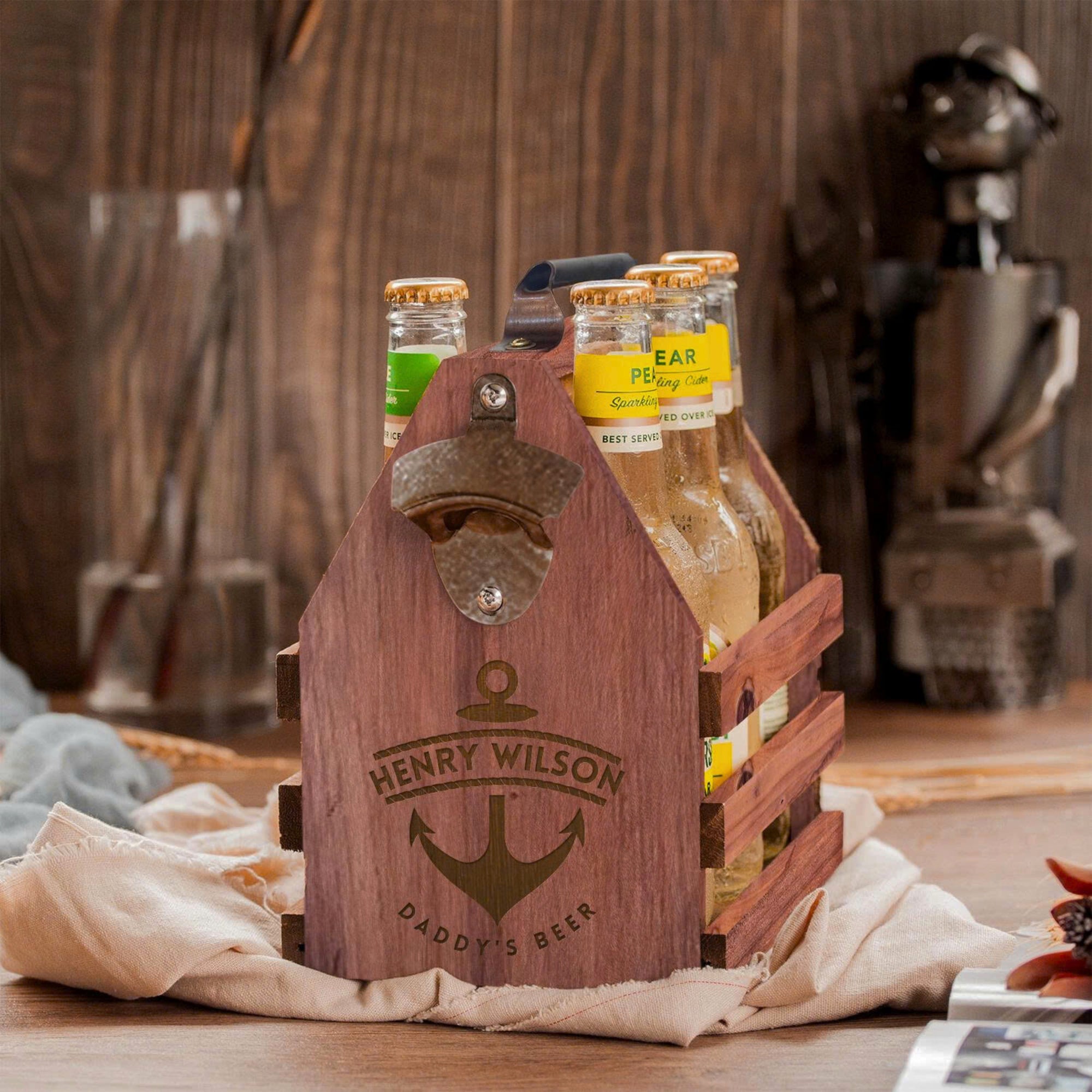 Engraved Wooden Beer Bottle Carrier 6 Pack with Opener